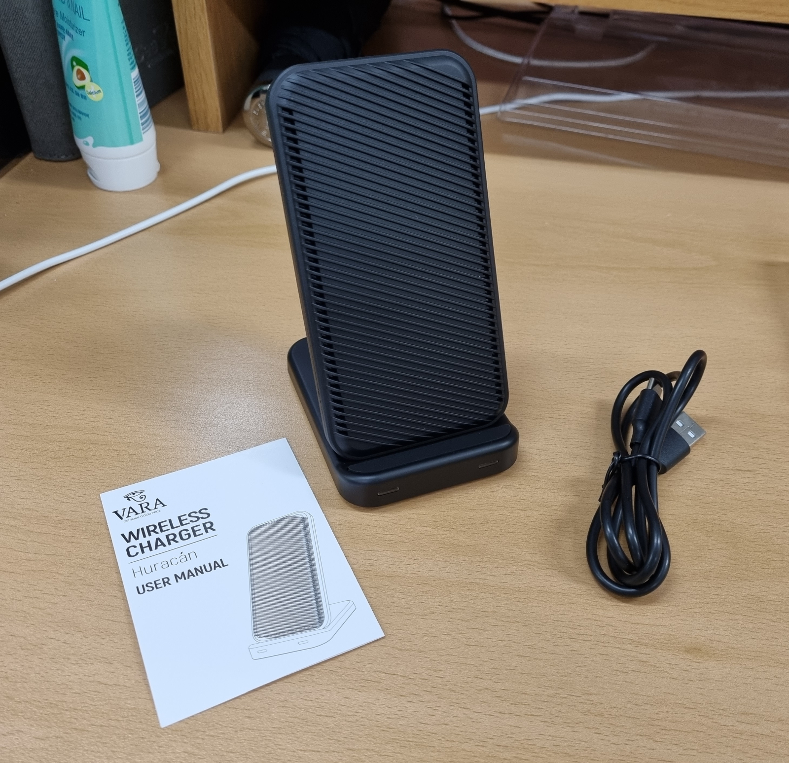제품 구성입니다. 무선 충전기 본체와 USB 케이블, 그리고 설명서가 들어 있습니다. 케이블은 USB C Type이며 충전용 어댑터는 포함된 구성이 아니기 때문에 고속 충전(15W, 9V)이 지원되는 어댑터가 있어야 합니다.