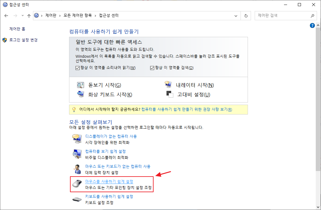 접근성 센터에서 '마우스를 사용하기 쉽게 설정' 항목을 찾아 선택합니다.