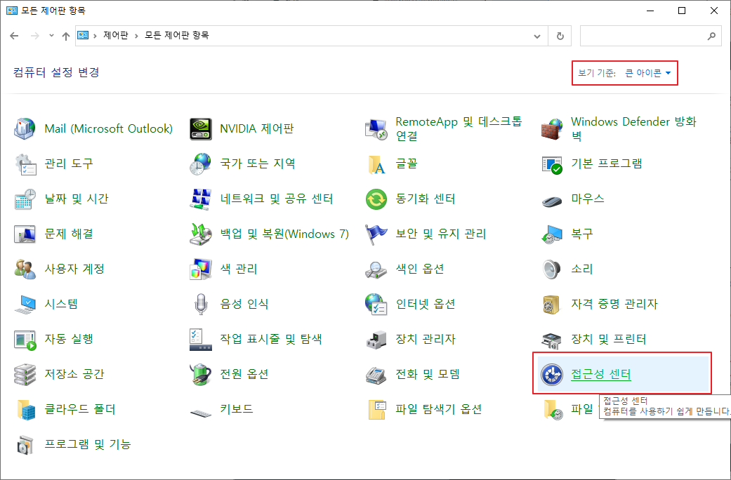 보기 기준을 바꾼 뒤 접근성 센터를 선택합니다.