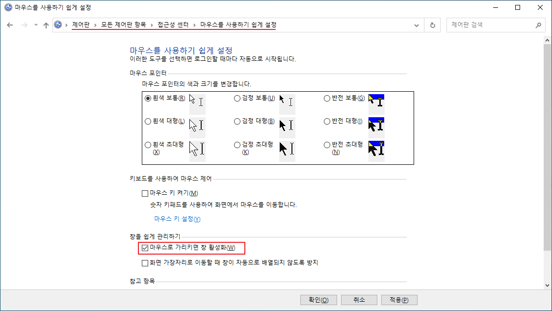 마우스로 가리키면 창 활성화(Windows 10 환경)