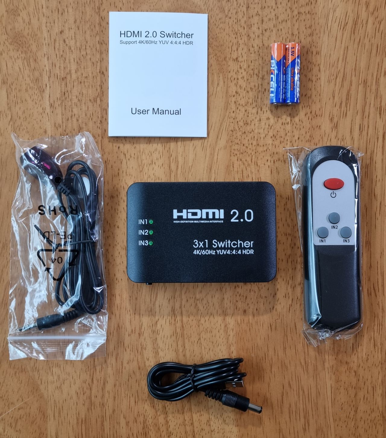 동일한 기능을 하는 다양한 제품들이 있었지만 2만 7천 원 정도 하는 제품을 샀습니다. 3x1 스위처라고 적혀 있고 HDMI 2.0 버전이라는 글자도 보이네요. 3개의 input 포트가 있고 1개의 output 포트가 있습니다. 분배기와 비슷해 보이지만 input/output 포트 수가 반대죠. IR이라고 적혀있는 구멍은 리모컨 수신기를 연결하는 구멍입니다.