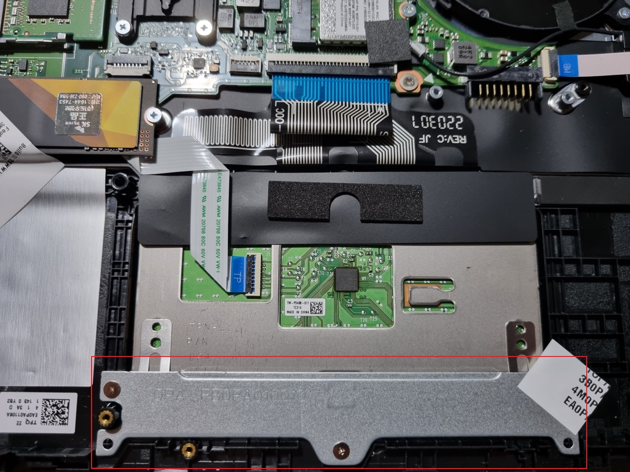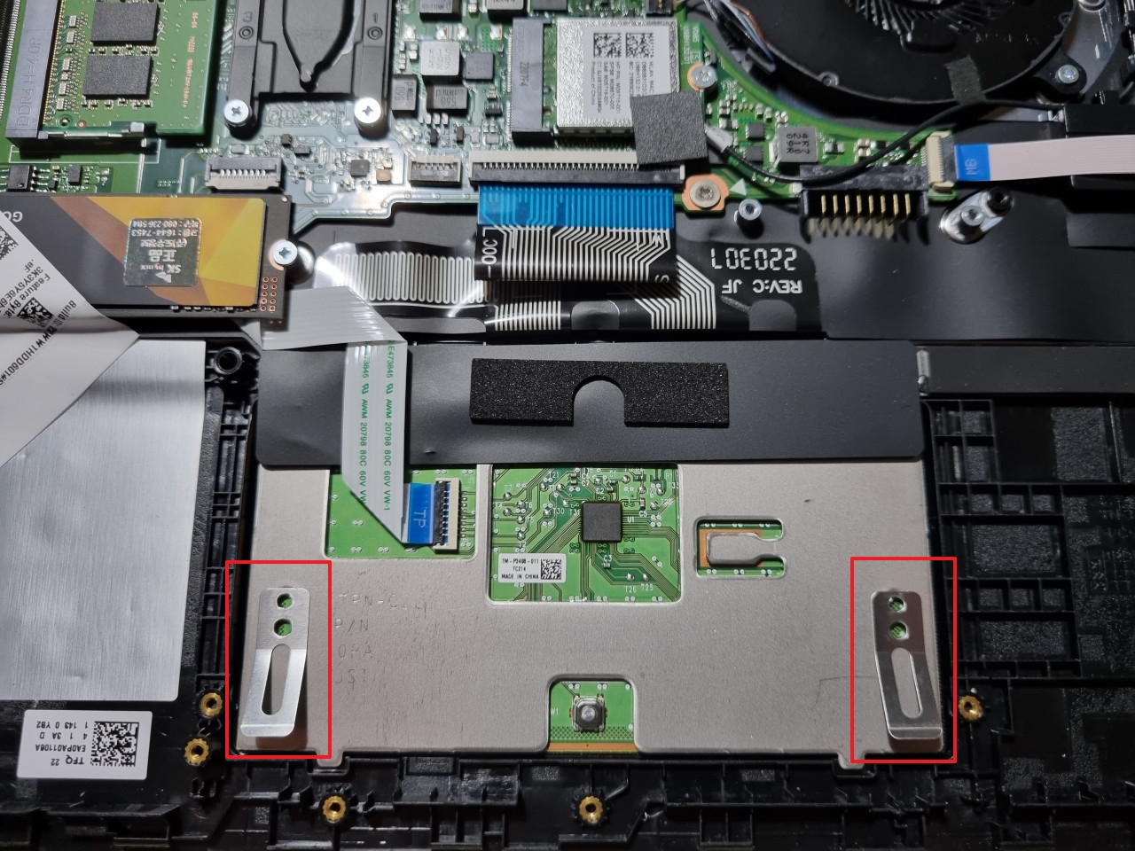 빨간 네모 부분의 지지대가 고정한 부분이 터치패드의 뒷면인데 여기를 열어보면 뭔가 이유를 알 수 있지 않을까요.