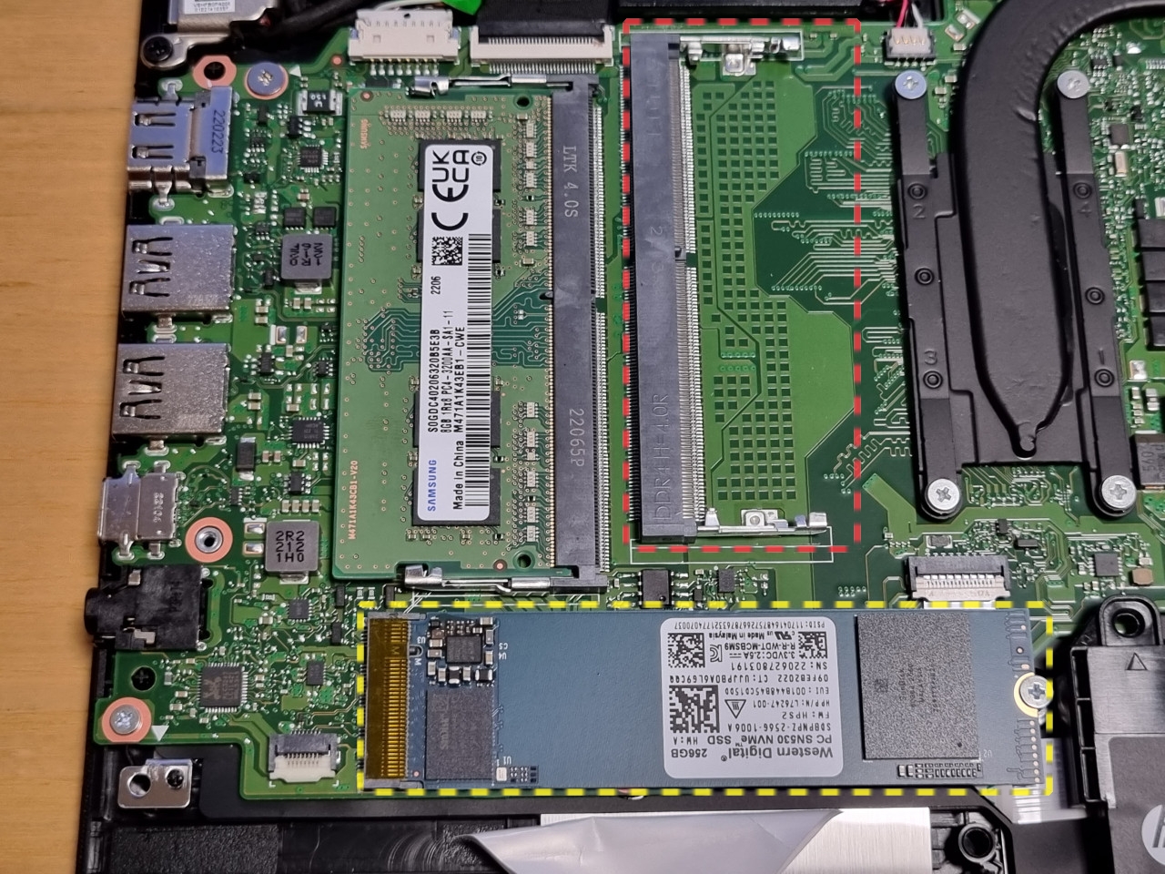 커버를 열고 보니 다행히 준비한 RAM과 같은 스펙의 램이 장착되어 있습니다. 빨간 네모 부분에 추가 구매한 RAM을 장착해 주고 노란 네모 부분의 기존 SSD(WD SN530)를 제거하고 P31을 장착해 줬습니다.